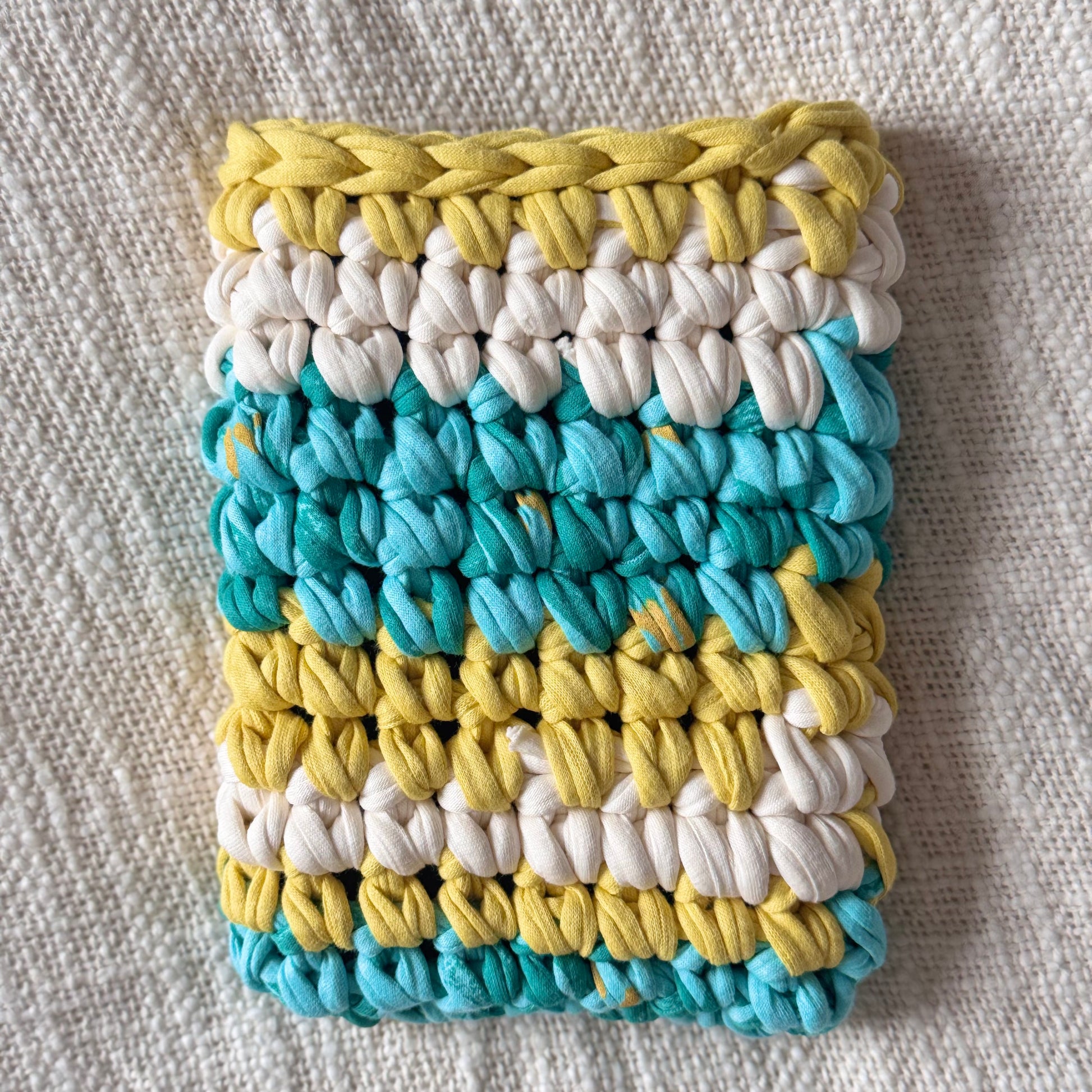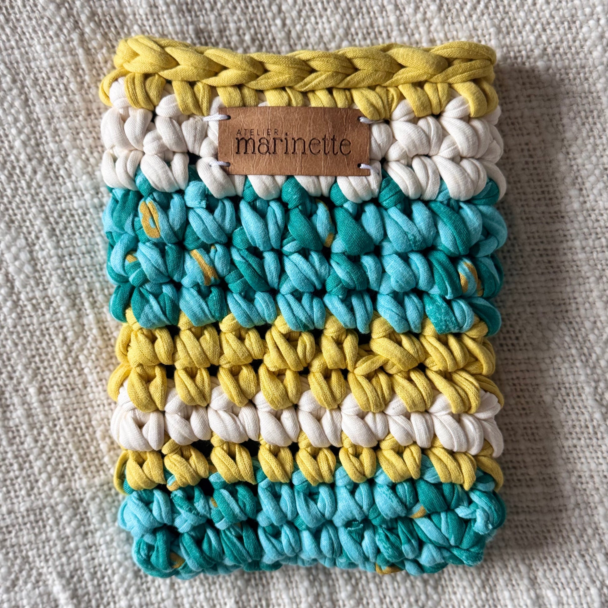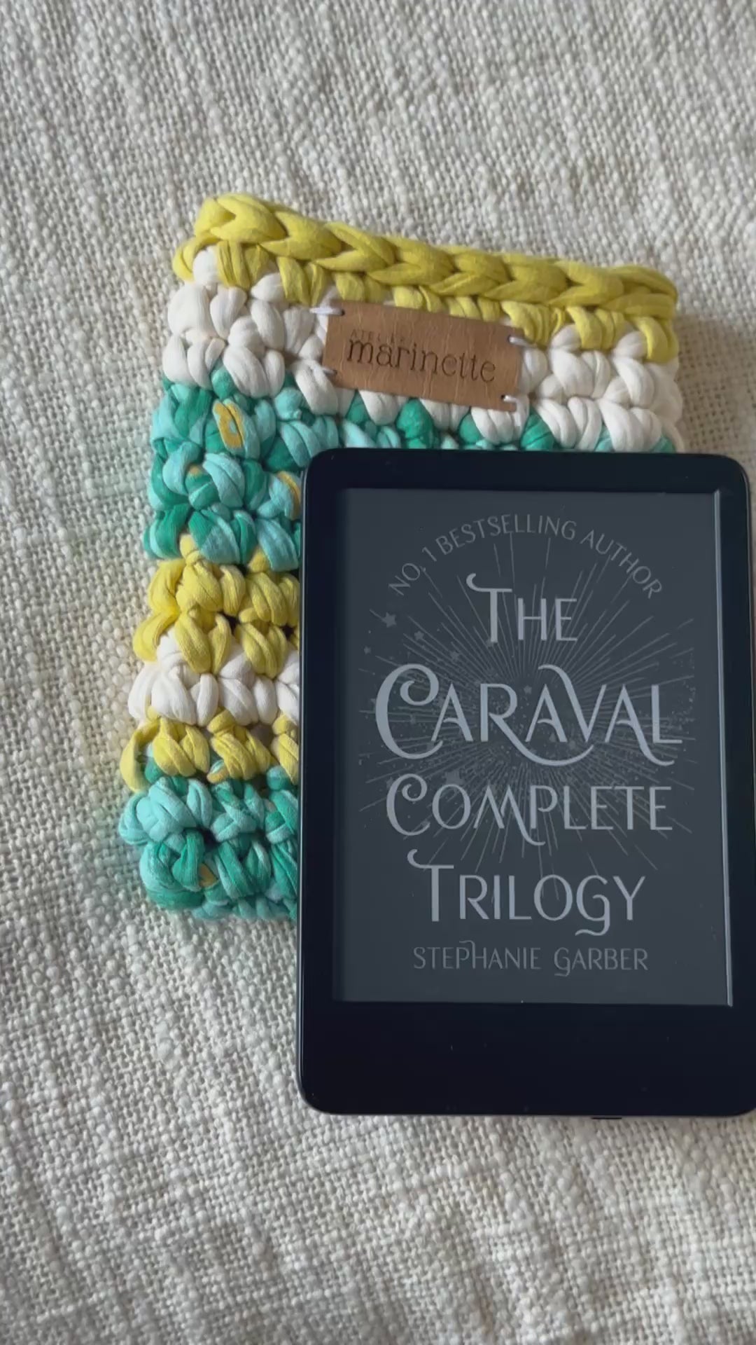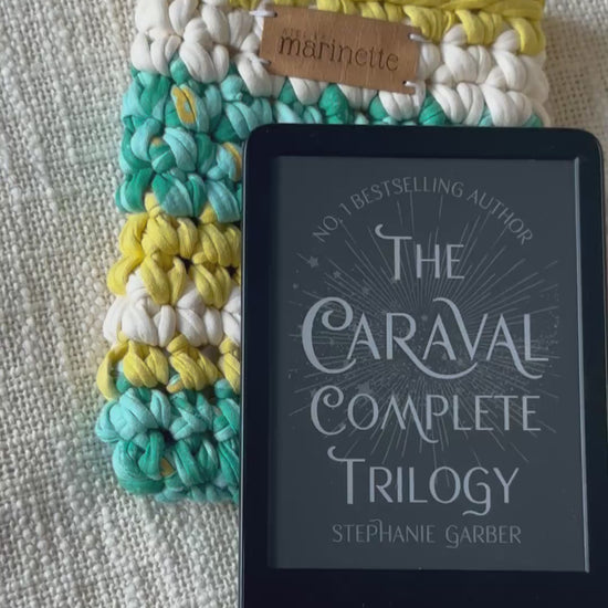 Housse en crochet artisanale pour liseuse 6" Kindle ou Kobo, fabriquée à la main à partir de fil de t-shirt recyclé
